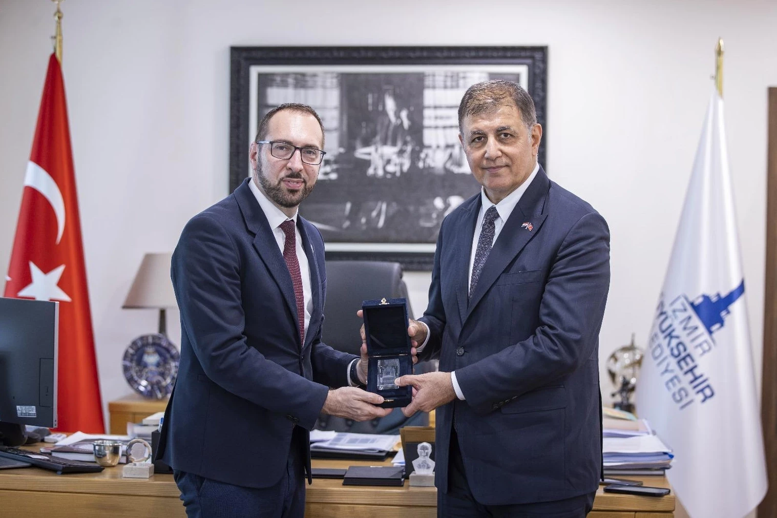 İzmir Büyükşehir Belediye Başkanı Dr. Cemil Tugay, 94. İzmir Enternasyonal Fuarı için kente gelen Belarus’un Ankara Büyükelçisi Anatoli Glaz ile Hırvatistan’ın Zagreb şehrinin Belediye Başkanı Tomislav Tomašević’i makamında ağırladı.