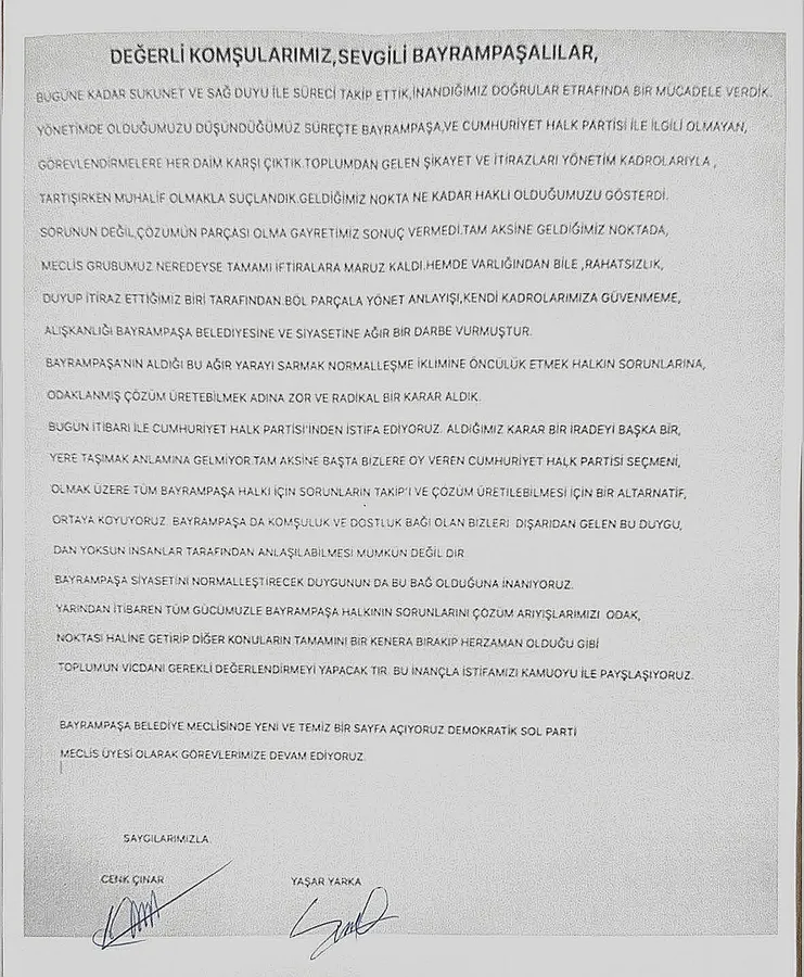 Bugün itibarı ile Cumhuriyet Halk Partisi’nden istifa ediyoruz. Aldığımız karar bir iradeyi başka bir yere taşımak anlamına gelmiyor. Tam aksine başta bizlere oy veren Cumhuriyet Halk Partisi seçmeni olmak üzere tüm Bayrampaşa halkı için sorunların takibi ve çözüm üretilebilmesi için bir alternatif ortaya koyuyoruz.