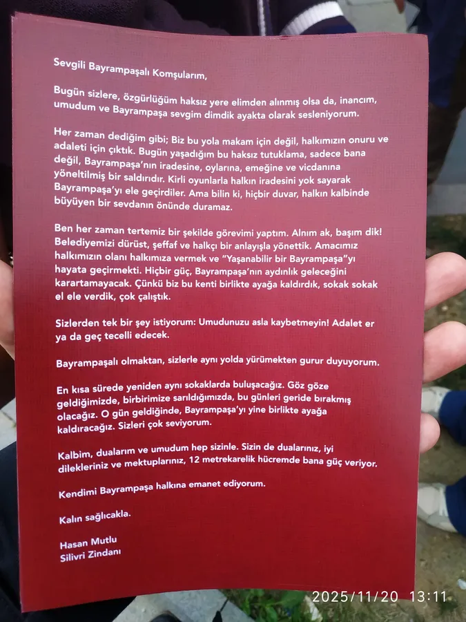 Haksız yere tutuklandığını ifade eden eski Belediye Başkanı Hasan Mutlu, Silivri Cezaevi’nden Bayrampaşalı hemşehrilerine hitaben duygu dolu bir mektup kaleme aldı. Mutlu mektubunda, özgürlüğünün elinden alınmasına rağmen umudunu, inancını ve Bayrampaşa sevgisini kaybetmediğinin altını çizdi.