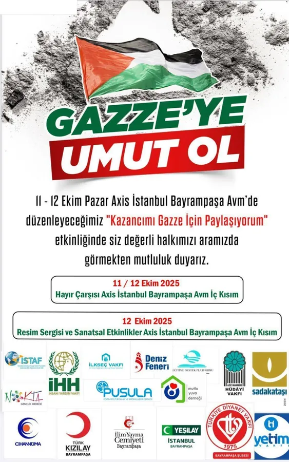 İHH’nın öncülüğünde, Sadakataşı, Hüdayi Vakfı, Deniz Feneri gibi kuruluşların destekleriyle ve 25 sivil toplum kuruluşunun katılımıyla düzenlenen “Gazze’ye Umut Ol – Kazancımı Gazze İçin Paylaşıyorum” etkinliği, İstanbul Bayrampaşa AXİS AVM girişinde başladı.