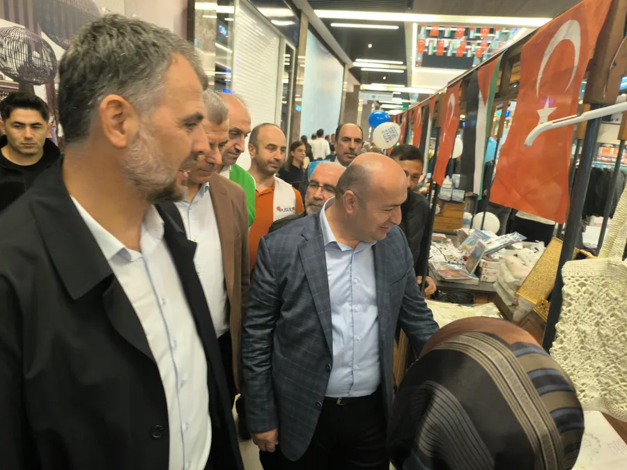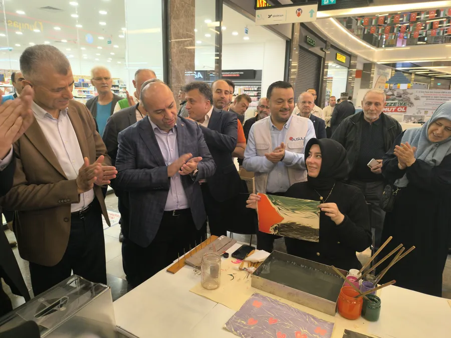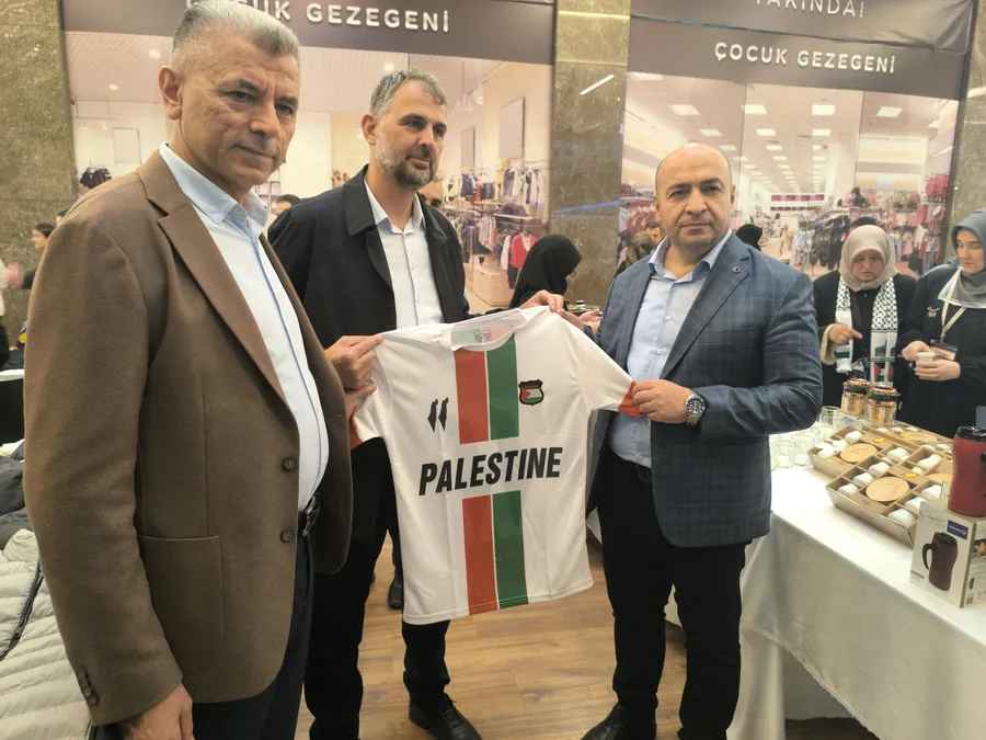 Kaymakamlar etkinlik alanını gezerek Ebru Sanatçısı Nurbana Yaşar’ın Filistin bayrağı çalışmasını izledi ve Filistin tişörtü hediye edilmesinin ardından bağışta bulundular.